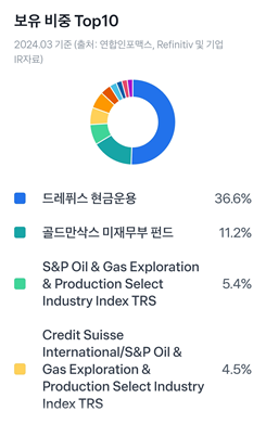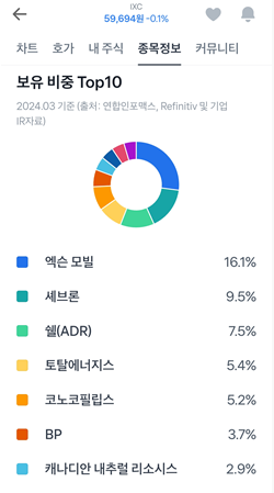 위에 ETF 이전에 주식종목으로 살펴보았던 기업들의 목록이 눈에 띕니다. 탐사 및 제조, 수송, 판매 등의 기업이 골고루 섞여있어요.