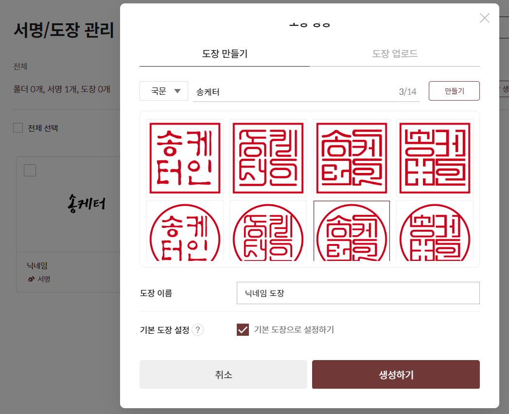 4) 싸인은 pc로 바로 사인할 수도 있고, 파일업로드 가능 / 도장 역시 파일업로드 가능 : 자동으로 만들어주는 생성기능 활용으로 작업진행 샘플 보여드릴게요.