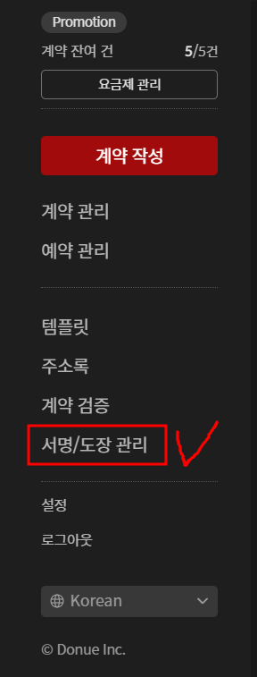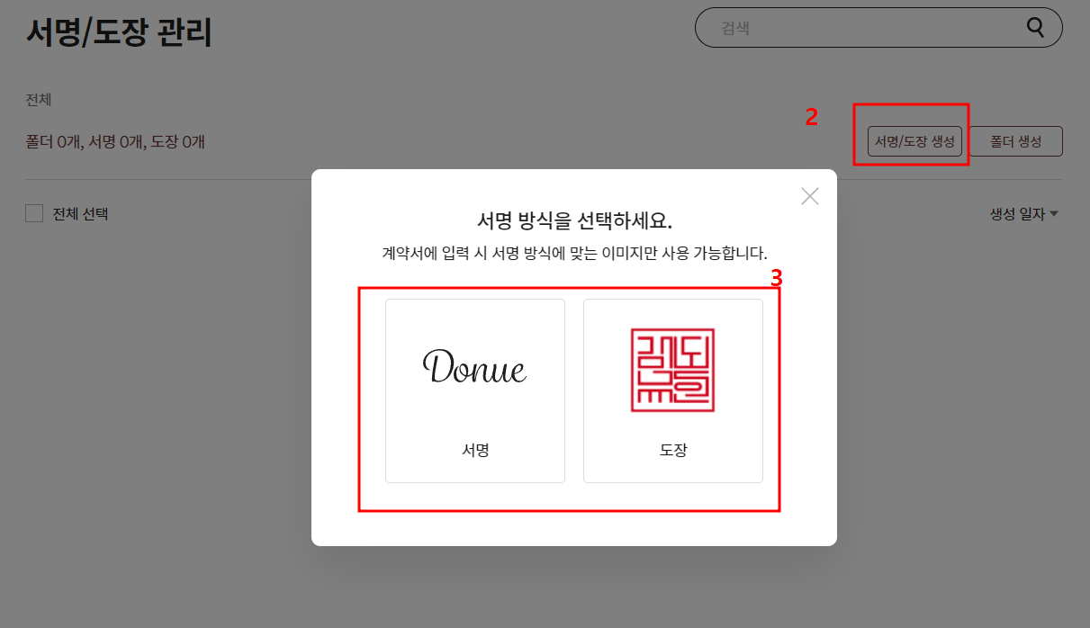 3) 좌측 메뉴에서 [서명/도장 관리]-[우측에 서명/도장 생성]을 눌러, 전자서명 만들기 할 방식을 선택합니다.