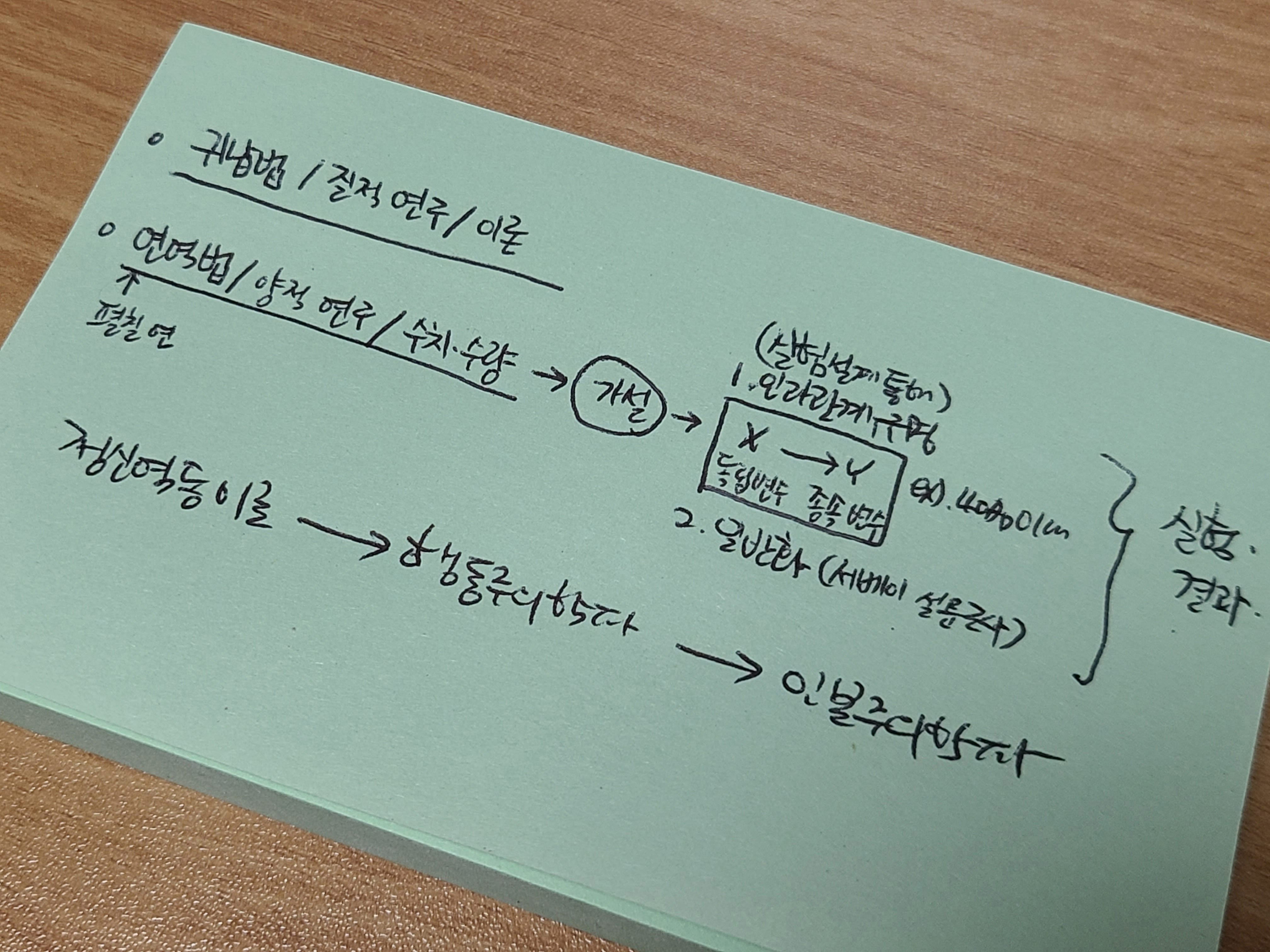 - 연역법 / 양적 연구 / 수치,수량화 => 가설 => 1. 인과관계 규명(원인과 결과) 2. 일반화 / 실험설계 VS 일반화(서베이 ex.설문조사)