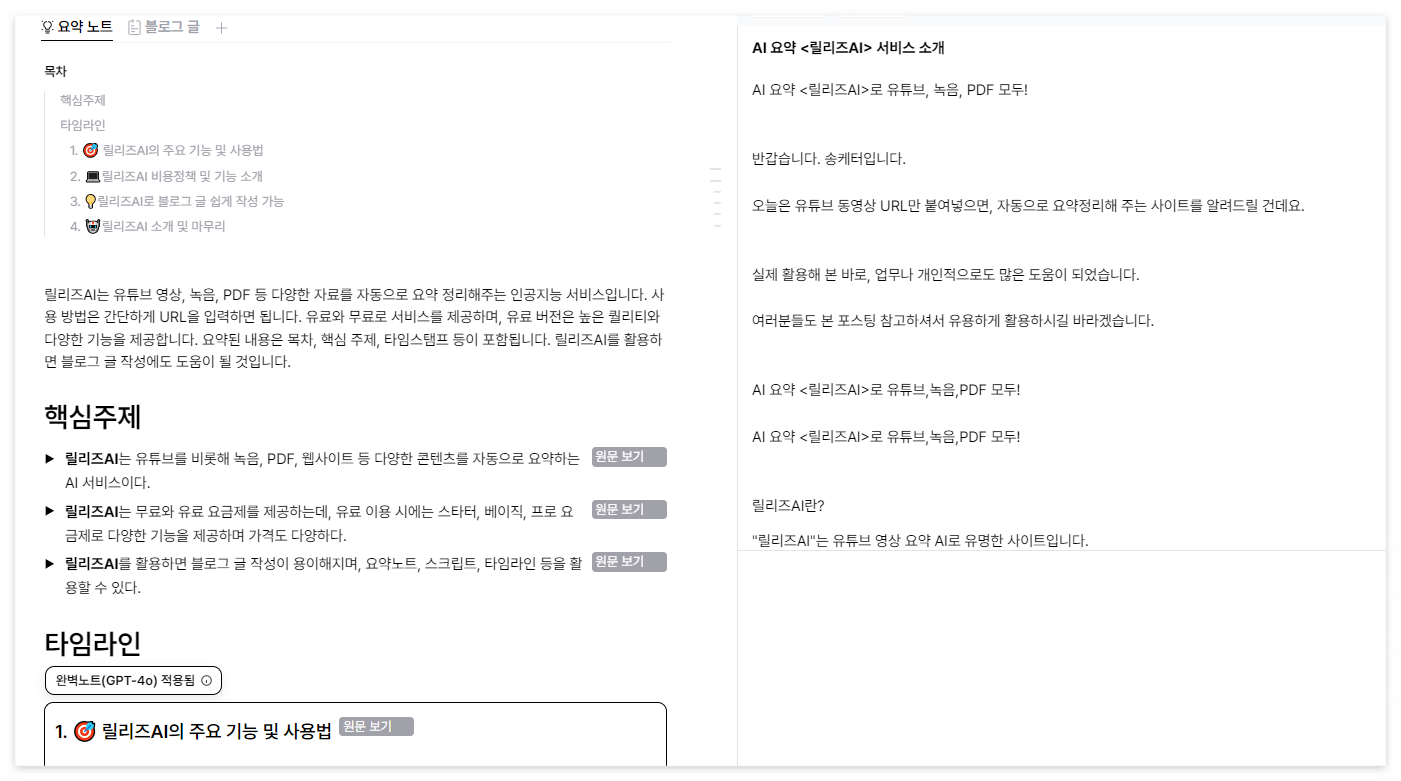유튜브 영상 요약 서비스로는 릴리즈ai가 대표적인데요.